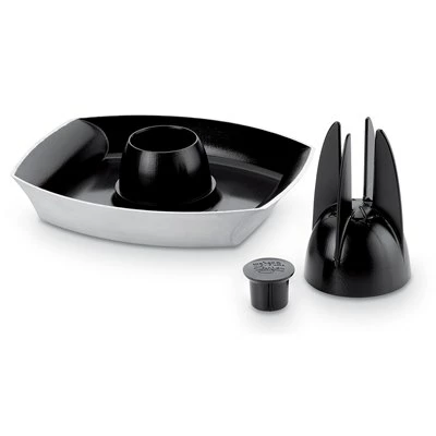 Weber say, Prepare a crispy yet moist chicken with the subtle flavours that are only produced by beer, juice or wine. The Deluxe Poultry Roaster holds liquid that fills your poultry with flavour and has a cap to lock in the steam, while the base captures juices for basting. After the plates have been cleared and stomachs are full, the ceramic non-stick coating makes cleaning easy.